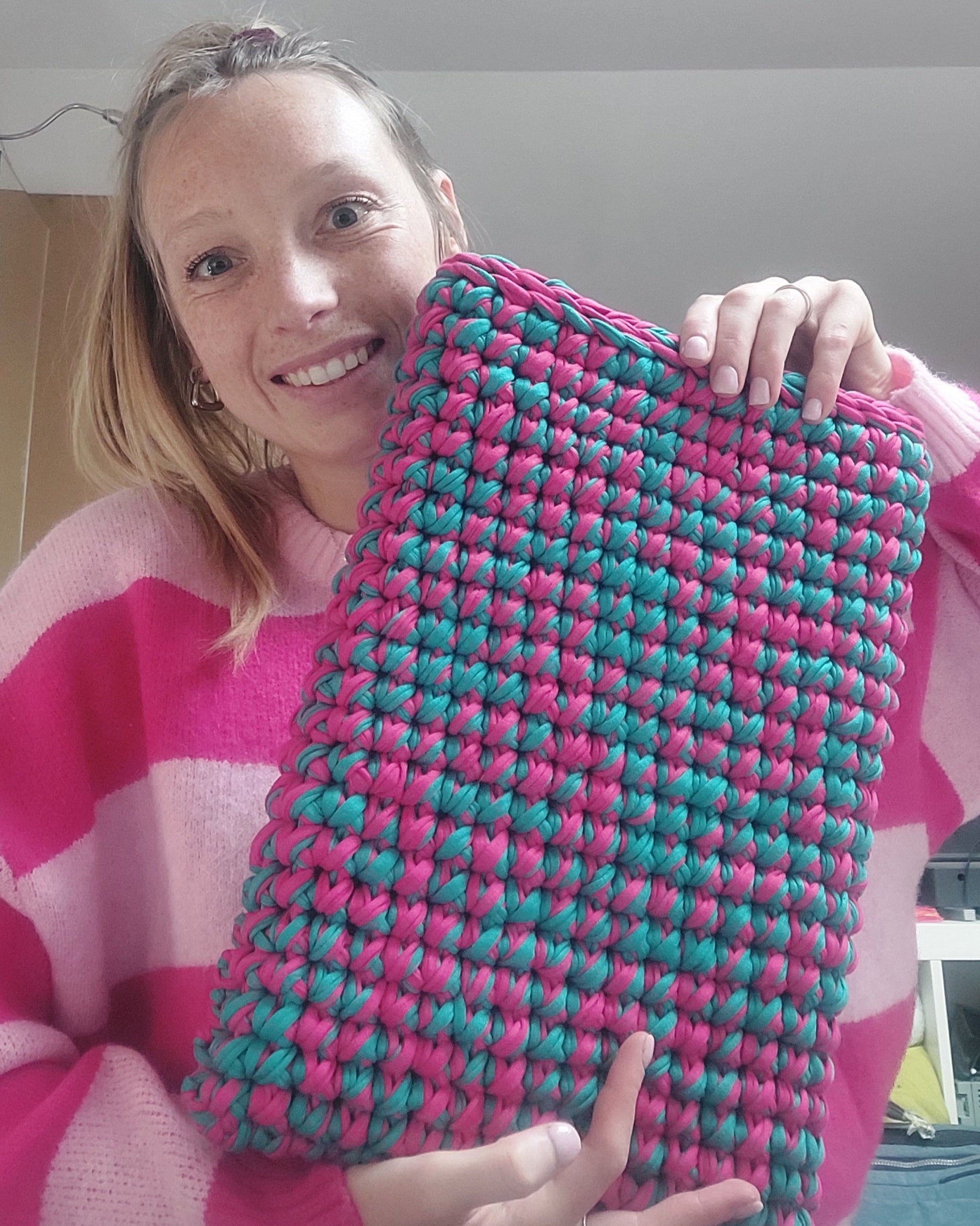 Een unieke laptophoes die met de hand gehaakt werd. Beschikbaar in 2 formaten.