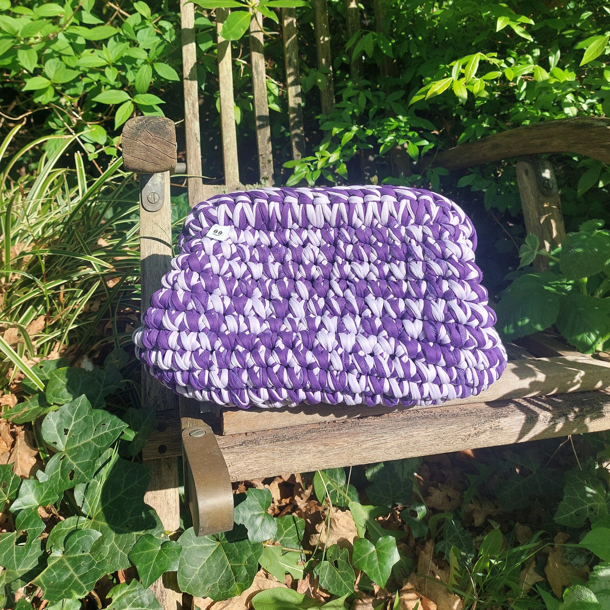 Handgehaakte jumbo clutch uit t-shirt yarn. Deze is perfect als toiletzak want hij is groot genoeg om al jouw favoriete skincare producten in mee te nemen.