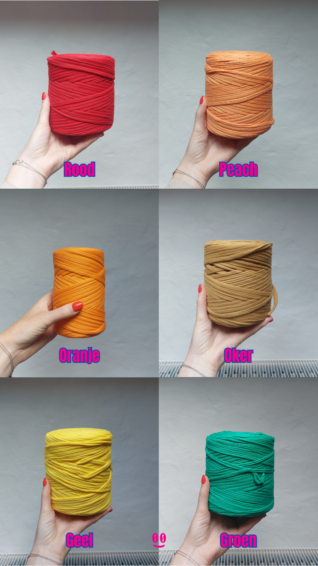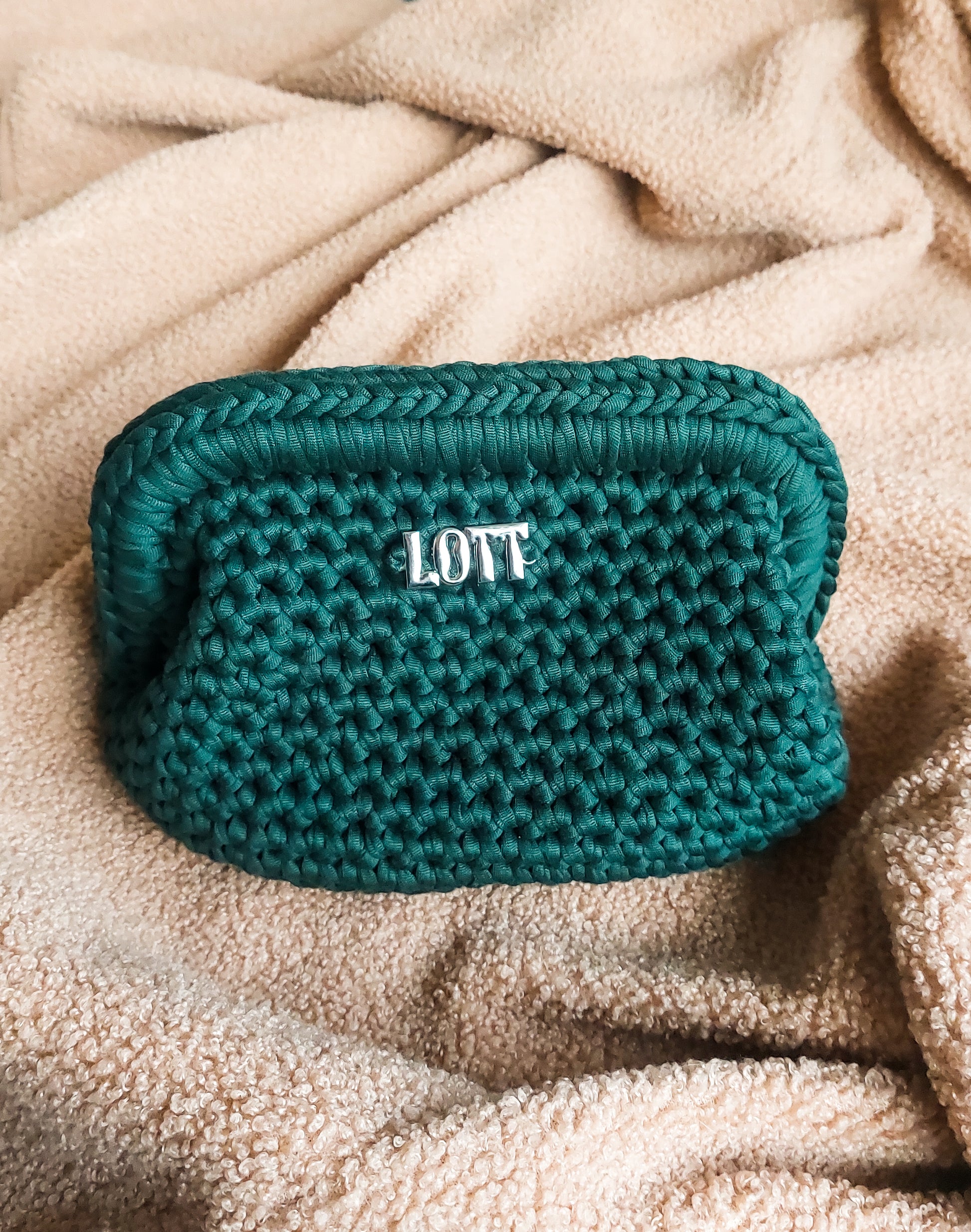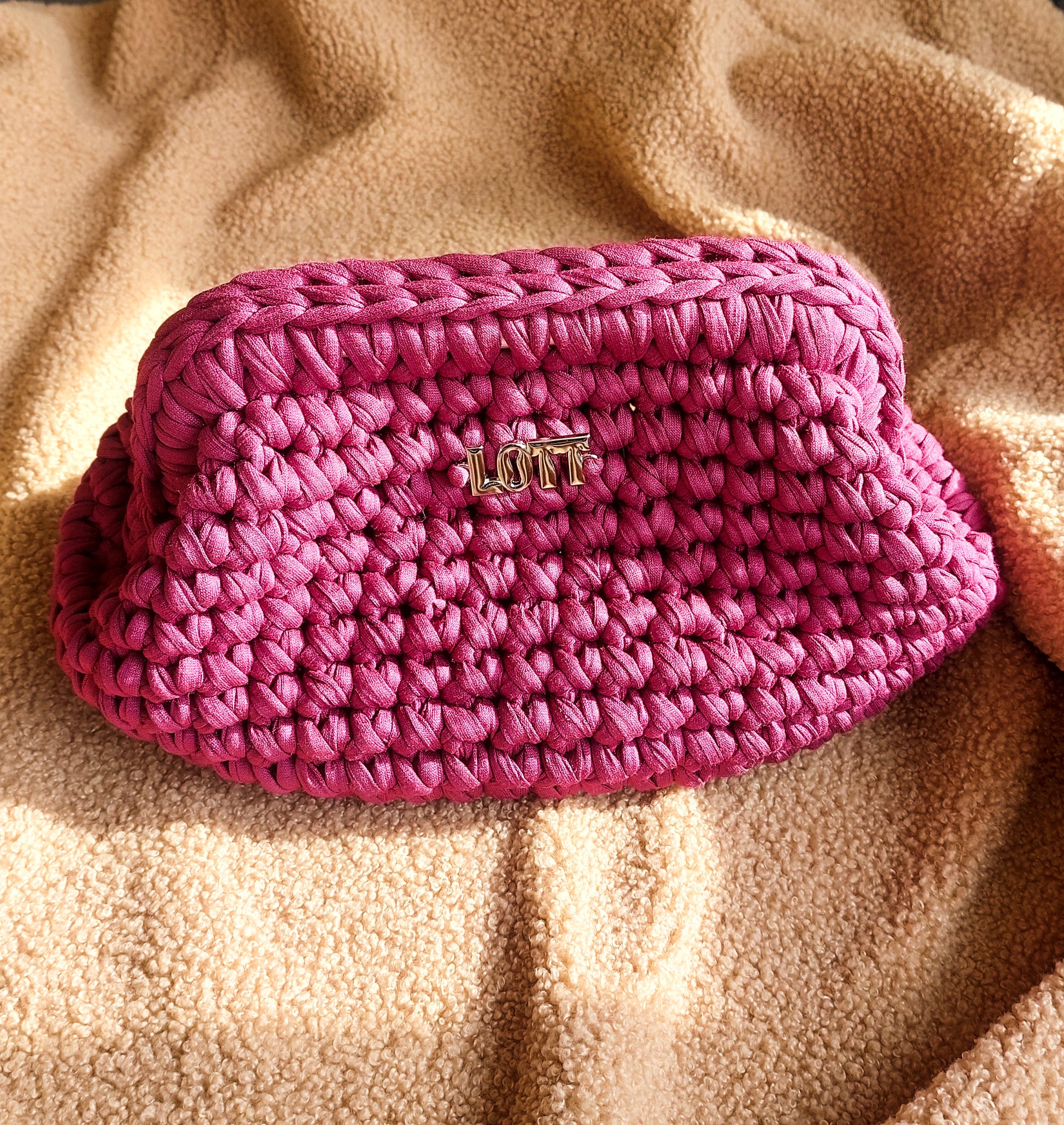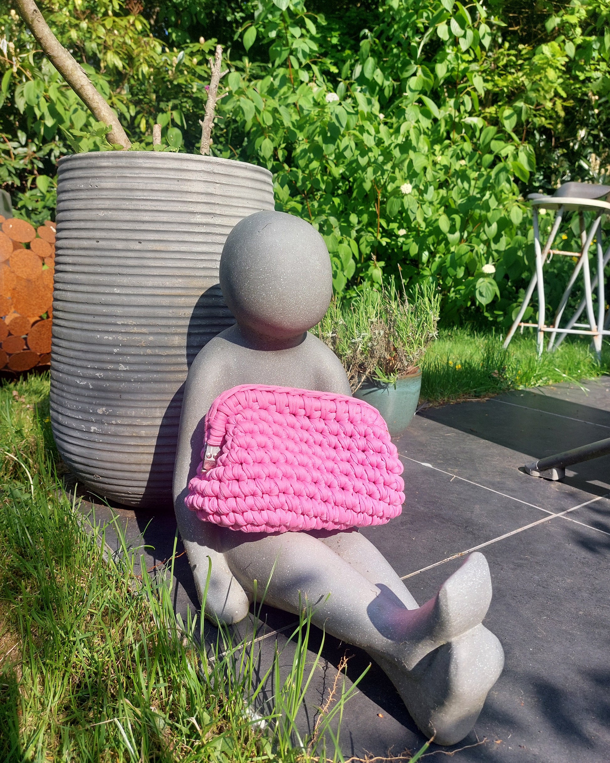 Handgehaakte clutch uit t-shirt yarn met klem als sluiting.